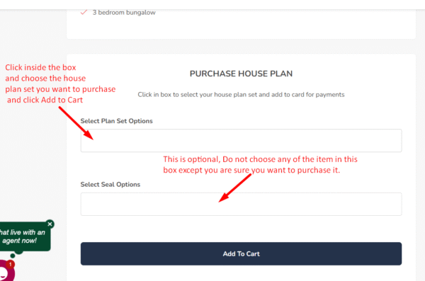 If no further clarification, quickly proceed by clicking inside the box on your right-hand side to select the house plan set you want to purchase before you click add to cart. (See video of how to purchase a house plan with your mobile phone.) After you have add to cart your preferred house plan, you will be redirected to the cart page where you will need to confirm again what you want to purchase is exactly what you have on the cart page. If there is a discrepancy at the cart page you can adjust it and update your cart page before proceeding to the checkout page.