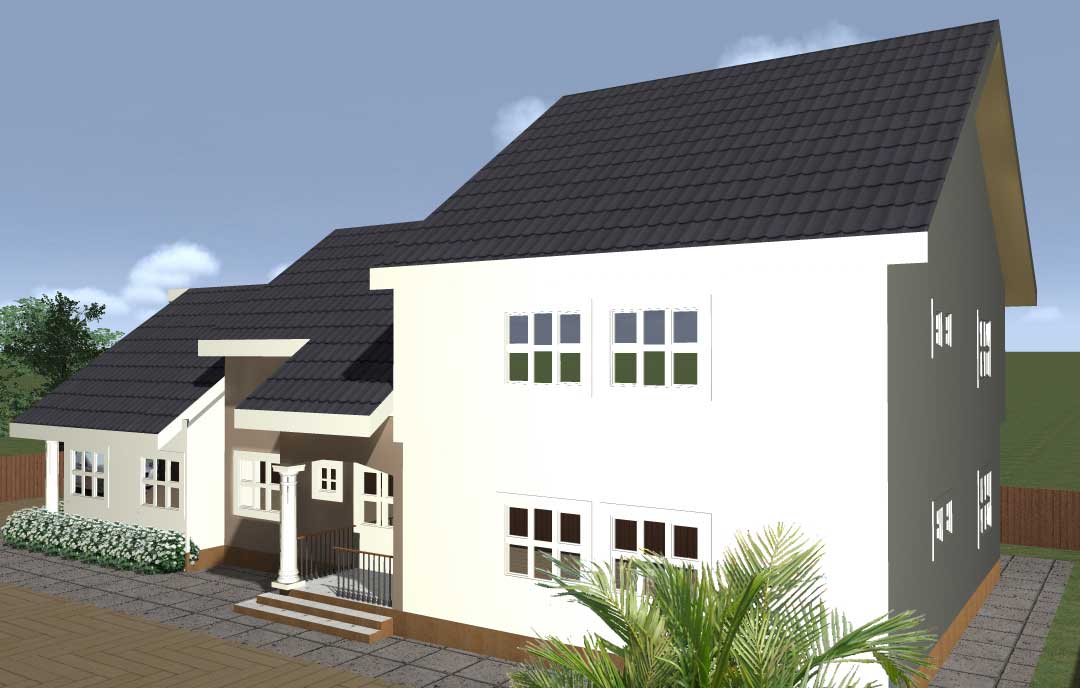 This modern duplex design presents a well-organized six-bedroom family home arranged on two functional levels. The ground floor accommodates the bulk of the living spaces, including four bedrooms, generous communal areas, and service zones. From the main entrance, a welcoming sit-out leads into the main lounge, which connects directly to the dining area and a guest room . The layout provides a clear circulation pattern through a central lobby that links the living room, kitchen, and stair hall. The kitchen with an attached veranda is positioned for easy outdoor access, while supporting spaces such as a store, visitor’s toilet, and walkway improve everyday convenience . Three additional bedrooms are located on this level, each with nearby toilet facilities, making the floor suitable for a large family or multi-generational living.